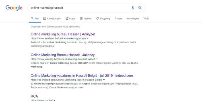 - Maak variaties op basis van de locatie, bijvoorbeeld 'online marketing Hasselt' vs. 'online marketing Limburg'.