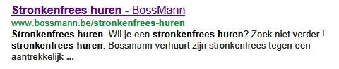 Vandaag zocht ik nog eens op Google of ik al op de eerste 5 pagina's te zien was, en neen hoor, nog geen spoor van een goede Google score. Echter, via het ondertussen gekende commando 'site:www.bossmann.be [spatie]stronkenfrees[spatie]huren' zag ik wel dat de pagina al ergens in Google zat.