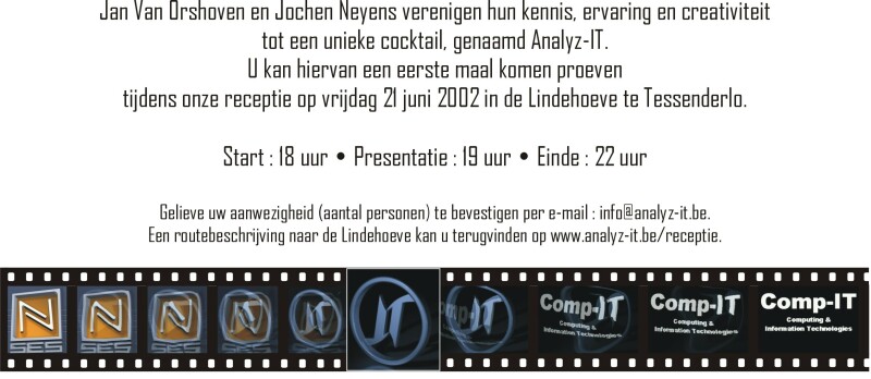 Tussen maart en juni van het oprichtingsjaar zaten de 2 oprichters Jan en Jochen nog vrijwel fulltime bij hun vorige werkgevers (Janssen Pharmaceutica en Elektro Nite). Na die periode was het tijd voor een openingsreceptie, dus hebben we de koe bij horens gevat en deze gegeven in De Lindehoeve te Tessenderlo. Hieronder nog een foto van de uitnodiging van destijds