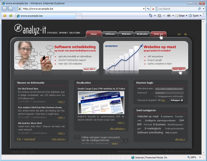 Merk op dat we in die tijd al dachten aan usability: steeds zichtbaar menu, logo links bovenaan, taalswitch bovenaan, etc...