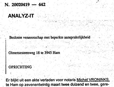 Analyz-it werd opgericht op 27 maart 2002. Hieronder een knipsel uit de oprichtingsakte.