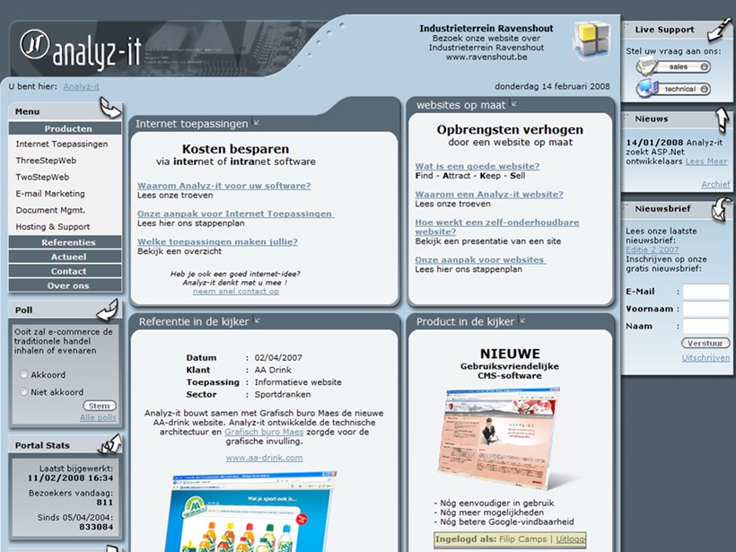 Onderstaande site heeft het licht gezien van 2004 tot begin 2008. Het is in die periode dat we gegroeid zijn naar 10 en meer mensen. Toen hebben we zeer veel websites gebouwd en enkele succesvolle e-commerce toepassingen, die tot op heden nog dagelijks meedraaien.