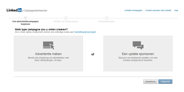Om te beginnen moet je een keuze maken tussen een advertentie of een sponsored update. Met een sponsored update kun je updates van je bedrijfspagina promoten onder een doelgroep die je zelf kan selecteren.