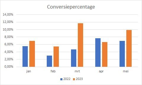 In 2023 brachten we dus meer converterende bezoekers naar de website waardoor de kost per conversie daalde. Dit resulteerde in meer aanvragen voor hetzelfde budget.