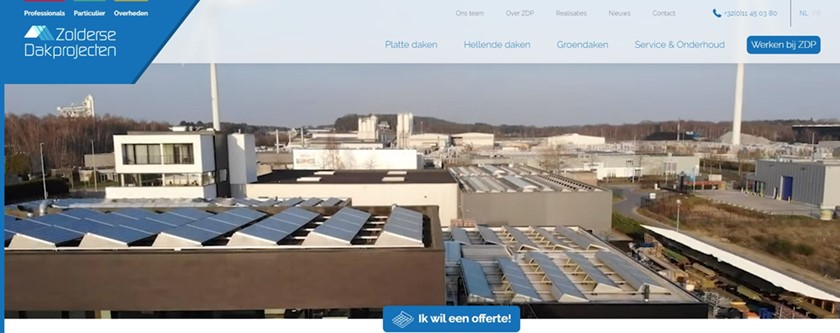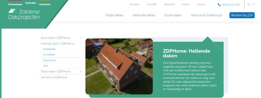 In het menu zie je als websitebezoeker meteen een onderscheid tussen de twee dimensies. Links boven is er de mogelijkheid om als particulier, professional of overheidsinstantie de website te verkennen, terwijl er in het hoofdmenu de keuze is tussen de verschillende diensten: platte daken, hellende daken, groendaken, service & onderhoud.