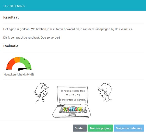 De kinderen ontvangen wekelijks een rapport met resultaten, zodat ze hun vooruitgang zien. In dit automatisch gegenereerde rapport zijn onder andere de gemaakte fouten en de typsnelheid opgenomen. Ook de ouders en de leerkracht ontvangen deze rapportering, zodat ze gerichte feedback en ondersteuning kunnen geven.