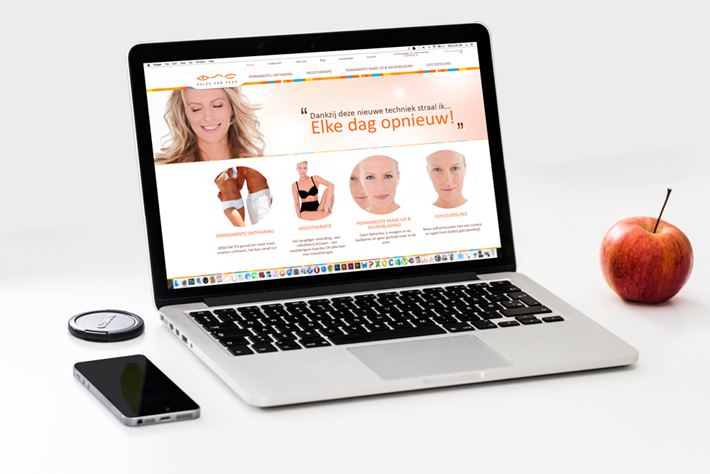 Met dit in het achterhoofd selecteerden we zorgvuldig de must-haves voor de opmaak van de eerste grafische previews. Zo werd het assortiment van behandelingen gereduceerd van 6 naar 4 om een rustiger geheel te creëren en qua kleurgebruik gooiden we het vrijwel meteen over een andere boeg. We namen afscheid van de 'dark side' en kozen voor een frisse website met leuke en speelse kleurbanden en gekleurde accenten, zonder de rust in het geheel te verstoren. Het voorgestelde design werd gesmaakt en grafisch goedgekeurd na ronde 1.