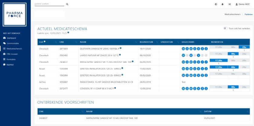 Via de webapplicatie kan het woonzorgcentrum snel het medicatieschema opvragen voor elke bewoner. Aan de hand van dit medicatieschema zal Pharma Force de nodige medicijnen leveren zonder dat het woonzorgcentrum dit moet bestellen. Zo wordt steeds de juiste medicatie geleverd op het juiste tijdstip. Dit zorgt ervoor dat het woonzorgcentrum kostbare tijd bespaart en ontzorgd wordt.